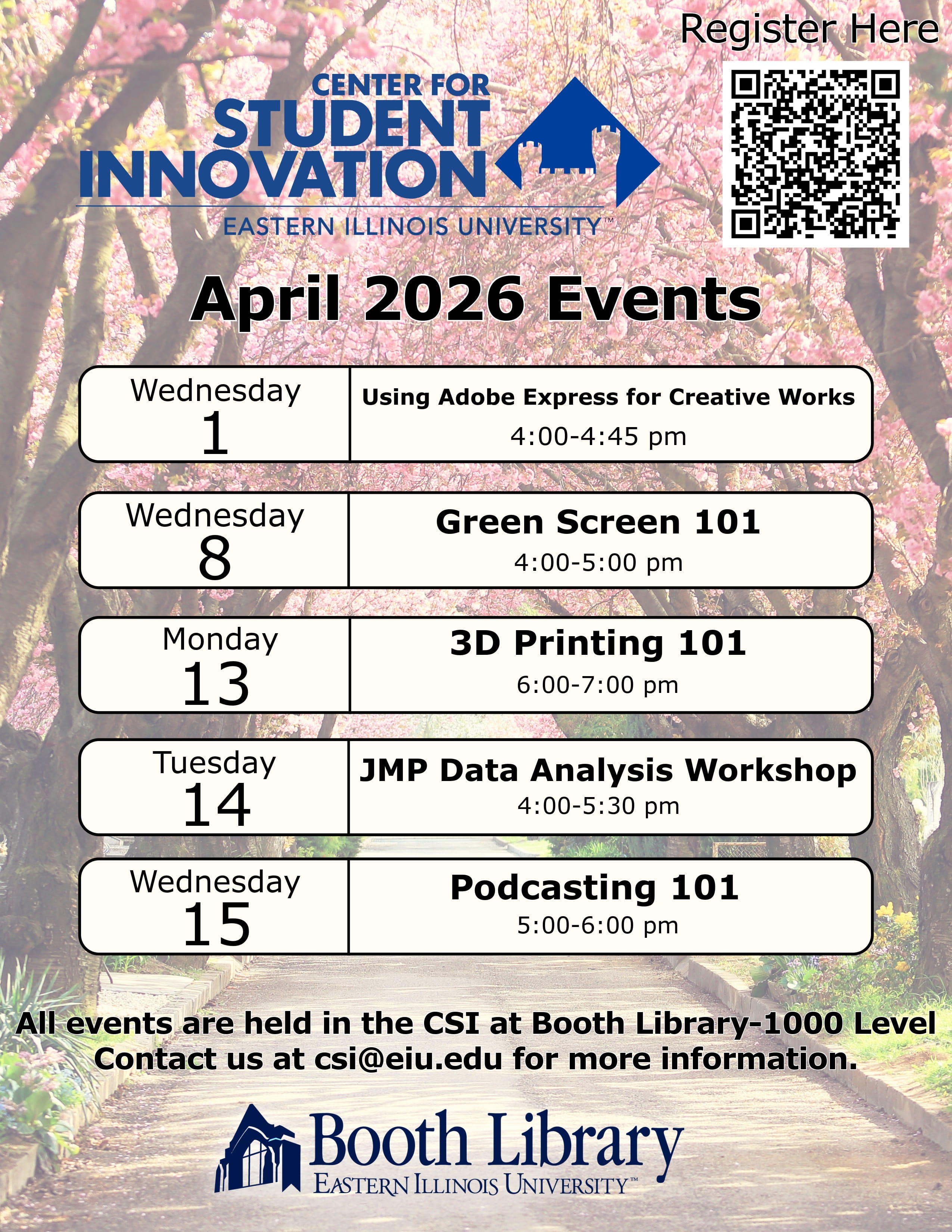 All events take place at the 1000 level of Booth Library in the Center for Student Innovation. Register to attend CSI workshops and learning labs through LibCal. For more information, please contact the CSI at csi@eiu.edu.